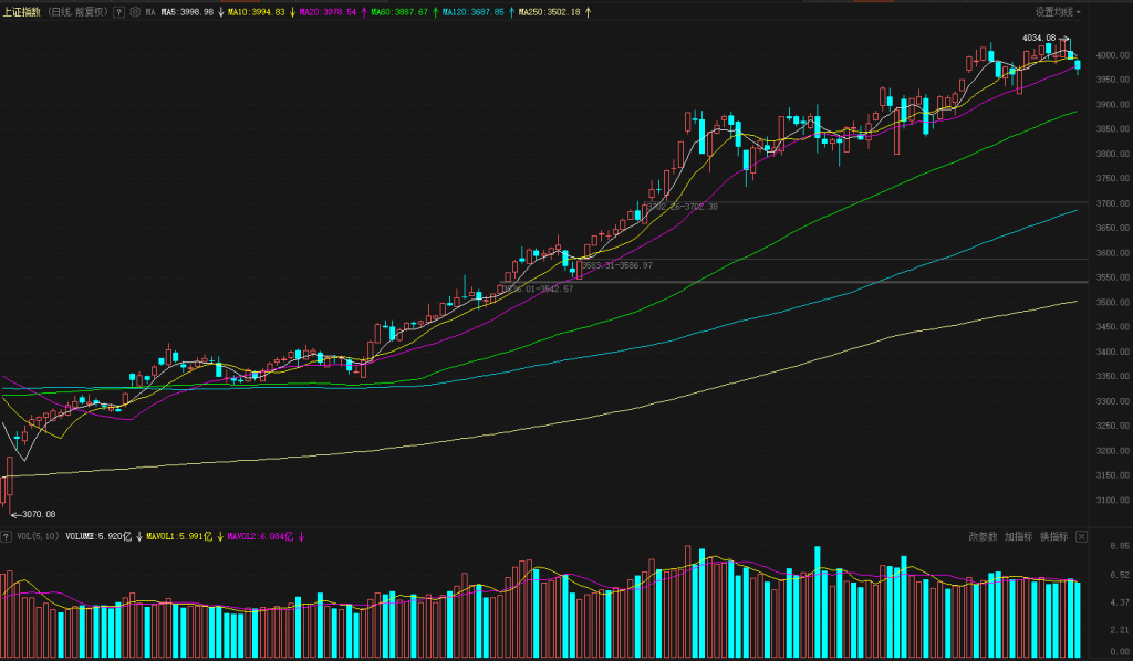 【市场观察】上证指数低开3988点,开盘之后形成一波震荡下行,随后煤炭、石油等部分权重板块开始带动指数反弹,但是反抽力度是比较弱的、午后再次震荡回落,全天没有一次红盘的机会、白线始终走势较弱,几次尝试反抽也没有资金跟进,最终上证指数报收3972点,下跌0.46%,创业板指数开盘上冲一度翻红、随后跟随大盘也是震荡回落,最终报收3105点,下跌0.20%。