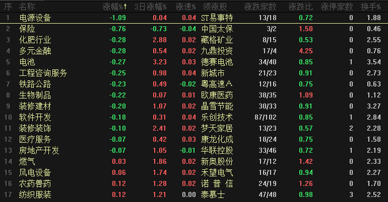 今日板块跌幅靠前的是电源设备、保险、化肥行业、多元金融、电池、工程咨询服务、铁路公路、生物制品、装修建材和软件开发等,这几个板块都是小幅调整,板块整体风险不大,重点看一下保险板块,保险近期走势较为疲软、对于指数也是形成拖累,短期形成较为复杂的震荡结构、盘中考验了11月24日的低点,同时保险周线也是震荡结构,保险板块作为指数的风向标、也反应出大盘当前的状态。