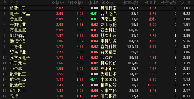 【热点板块】今日行业涨幅靠前的是消费电子、电子化学品、贵金属、采掘行业、有色金属、旅游酒店、通信设备、半导体、贸易行业和光学光电子等。四维分析来看,行业板块有73个上涨,其中有5个板块涨幅超过2%,下跌板块有13个,个股方面,两市上涨家数是3398家,涨停76家,下跌家数是1872家,跌停7家。盘面整体来看,上涨和涨停家数没有持续增长,还是处于分化的状态,板块轮动速度依然比较快。板块来看,涨幅榜有科技、有色金属和消费等,板块之间联动性并不强、找不到明显的炒作主线,下一个阶段可以重点关注两个方向,第一是消费电子,消费电子可以拆分成消费+科技两个概念,未来会受到更多政策上的支持,近期消费电子利好消息也是频繁出现,相关个股还有很多位置也比较低,这类品种可以关注。第二是商业航天,卫星互联网、空间站和商业航天等几个概念也是涨幅靠前,这个方向也是利好不断释放,资金对于这个方向早已提前布局,这个方向有望跑出几只黑马品种,商业航天相关个股也有一批是低位反复打底的、近期也开始尝试向上突破。