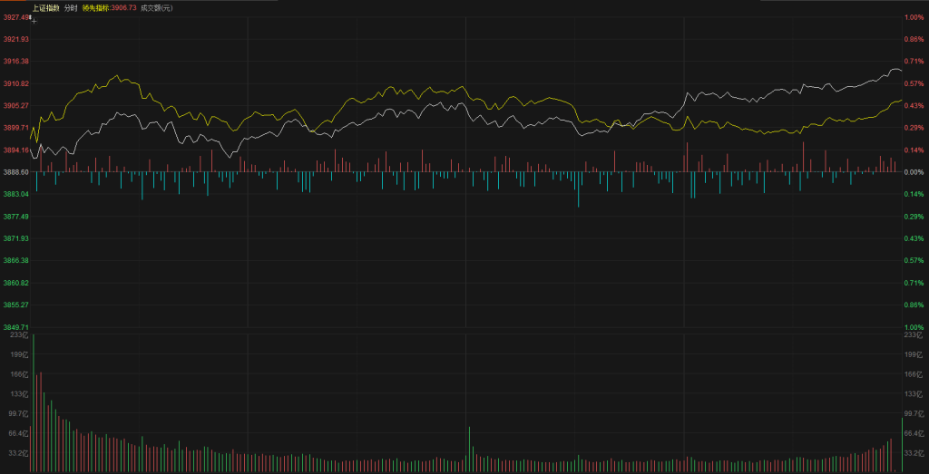 【市场观察】上证指数小幅高开3894点,高开之后开始缓慢震荡上行,整个分时走势来看,第一:反弹速度非常慢,反弹一波开始做震荡、再反弹一波继续震荡,没有出现进攻的节奏。第二:黄白线走势较为混乱、当前没有明确的领涨龙头,资金不知道该往哪个方向布局,大市值和中小市值是轮动节奏,第三:资金开始有小幅流入的动作,虽然流入幅度不大、但是早盘和尾盘还是有资金入场的动作,最终上证指数报收3914点,上涨0.65%,