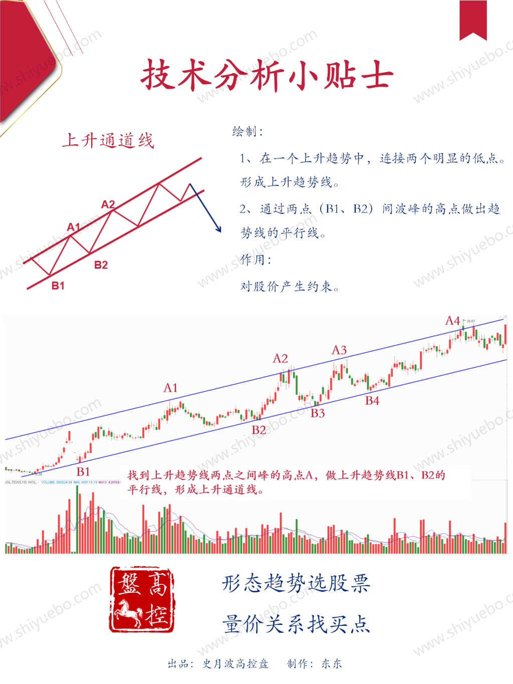 今天的技术分析小贴士:划线分析——上升通道线绘制:1、在一个上升趋势中,连接两个明显的低点,形成上升趋势线。2、通过两点(B1、B2)间波峰的高点做出趋势线的平行线。作用:对股价产生约束。