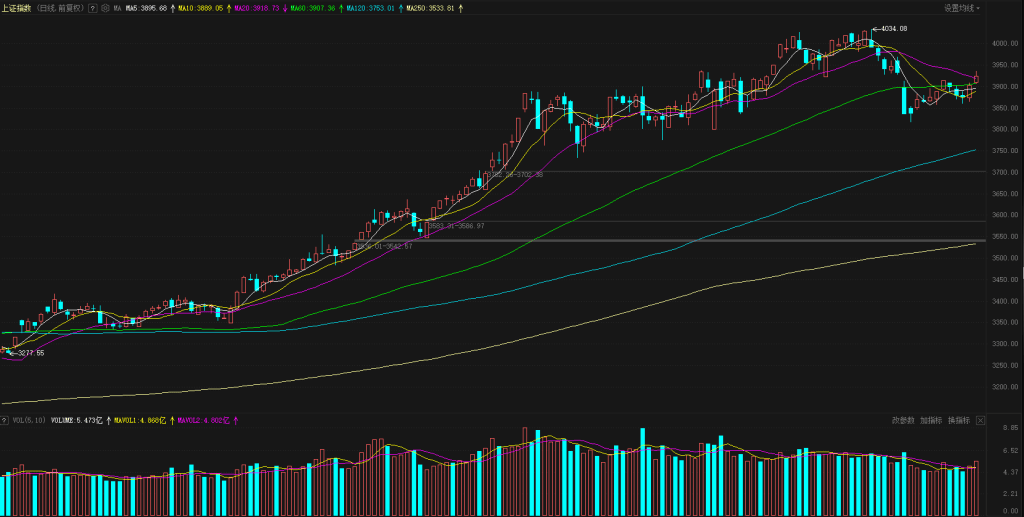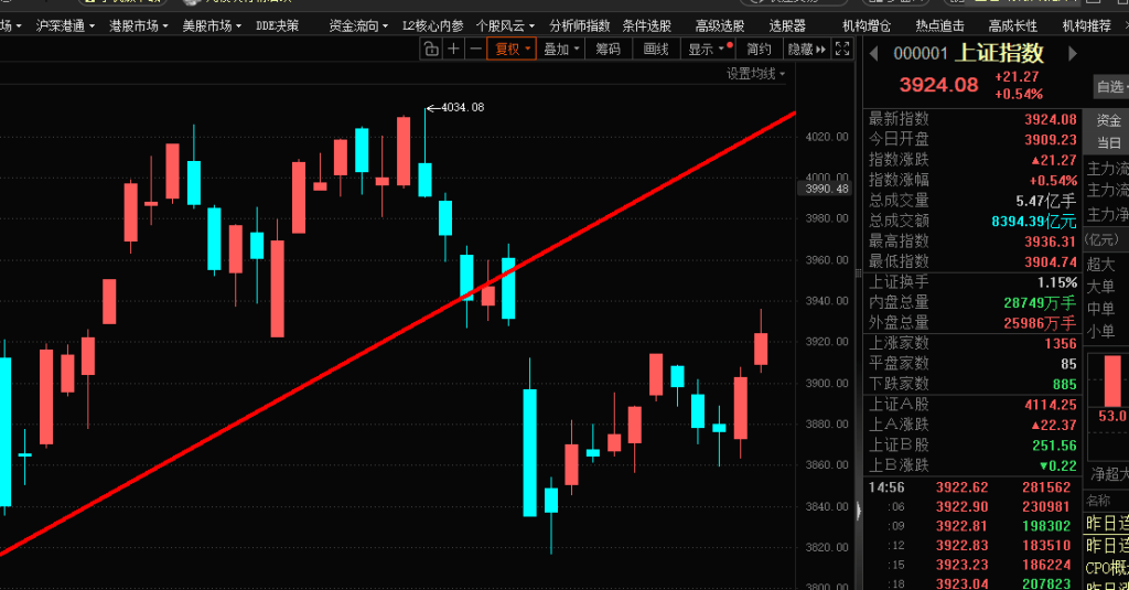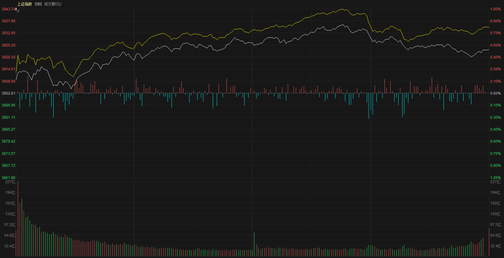 【市场观察】上证指数高开3909点,周末一系列利好刺激A股出现高开,高开之后形成一波震荡上行,10:00-14:00这个阶段呈现完整震荡上行结构,黄白线同时上涨、指数缓慢上推,反弹持续性也是不错、最高点上冲到了3936点,14:00之后指数冲高回落、但是整体回撤幅度不大,最终上证指数报收3924点,上涨0.54%,创业板指数也是同步上扬,最终报收3190点,上涨2.60%。