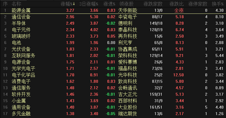 【热点板块】今日行业涨幅靠前的是能源金属、通信设备、半导体、电子元件、玻璃纤维、电池、光伏设备、互联网服务、电源设备、光学光电子等。四维分析来看,行业板块有66个上涨,其中有5个板块涨幅超过2%,下跌板块有19个。个股方面,两市上涨家数是3409家,涨停78家,下跌家数是1866家,跌停8家。盘面整体来看,虽然各大指数表现都比较强,但是板块和个股分化还是比较明显,热点板块资金持续流入、而弱势板块依然走势较弱,几个权重板块表现低迷、酿酒板块近期也是创出了新低。板块来看,能源金属、通信设备和半导体等行业是领涨的,近期出现异动的板块比较多,最强的主线有两条,第一:商业航天,商业航天已经炒作过一段时间、热度不减,现在商业航天这个大方向细分成几个行业,这几个行业开始形成轮动,今天领涨的是CPO和光通信模块等,商业航天热点开始扩散。第二:福建板块,附件板块今天有21家个股上涨,这个板块反弹强度近期是比较罕见的,第一轮福建板块是几只个股上涨,而第二轮炒作反弹力度更强、联动性更好,这两个方向可以持续关注。