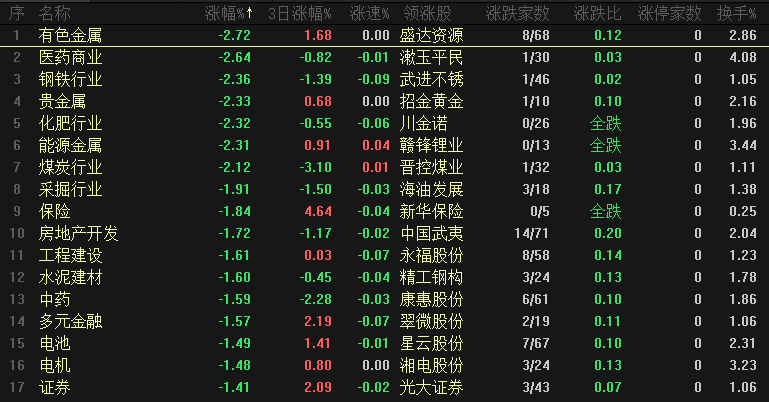今日板块跌幅靠前的是有色金属、医药商业、钢铁行业、贵金属、化肥行业、能源金属、煤炭行业、采掘行业、保险和房地产开发,权重板块集体出现调整,有色金属、煤炭和保险这三大龙头板块都是前期多方护盘的主力部队,今天集体出现调整,说明当前多方的任务目标已经完成,包括证券和银行也是小幅下跌,需要注意的是有色金属、能源金属、锂电池等短期涨幅较大的品种可能会出现快速的调整,这一批个股存在风险释放的需求。
