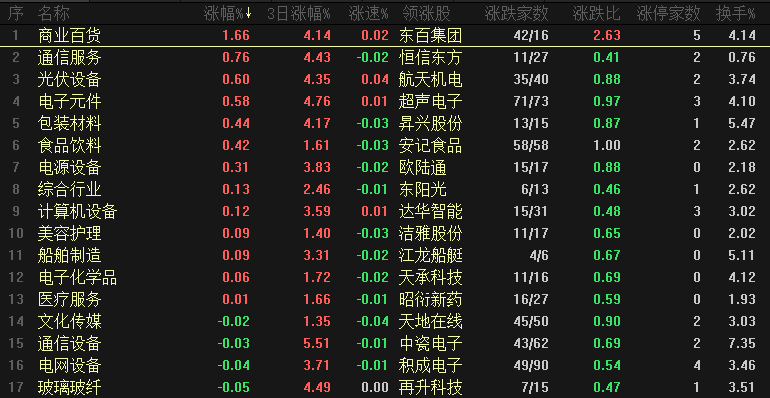 【热点板块】今日行业涨幅靠前的是商业百货、通信服务、光伏设备、电子元件、包装材料、食品饮料、电源设备、综合行业、计算机设备和美容护理等。四维分析来看,行业板块有13个上涨,涨幅第一的商业百货也仅有上涨1.66%,下跌板块达到73个,个股方面,两市上涨家数是1308家,涨停54家,下跌家数是4058家,跌停12家。盘面整体来看,利好消息刺激之后、市场又回到了原有的状态,超过4000家个股出现下跌,呈现弱势震荡的格局。板块来看,商业百货走势相对较强,有5只涨停的,商业百货这一波行情可以分为两类,第一类是福建本地股,包括东百、永辉,热门区域+商业百货,第二类是低位+低价的超跌补涨,这两种方式都是属于短线行情、很难形成中长期的反弹,这也是符合高控盘近期的才略,就是坚持快进快出、有能力驾驭的就进场吃一口,反弹起来小周期出现滞涨信号就可以兑现利润了。当前阶段可以继续关注福建板块低位品种,热门区域+热门板块这个思路,包括涨幅靠前的几个板块很多都是福建本地股上涨带动的。