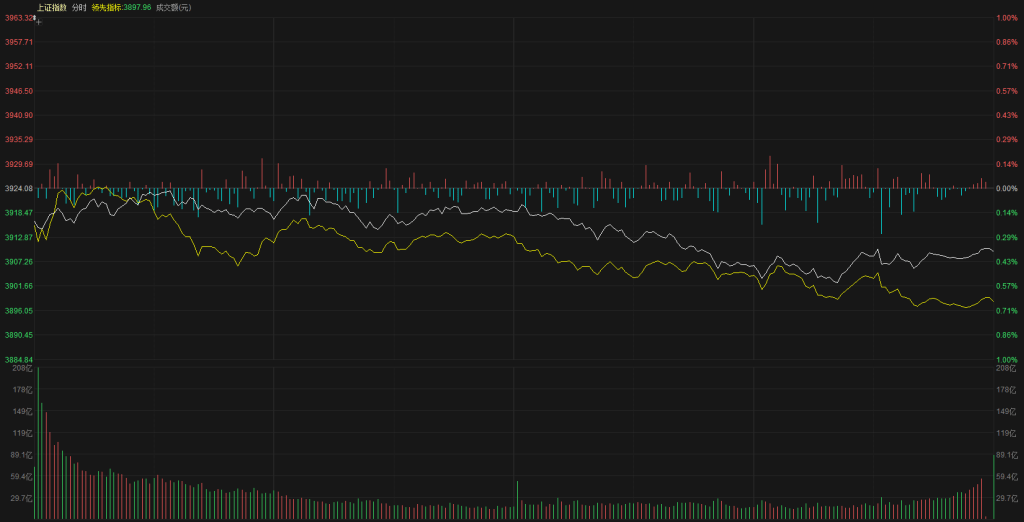 【市场观察】上证指数低开3916点,低开之后尝试进行一波震荡上行、但是这一次向上力度非常弱,指数弱势反弹维持了半个小时左右也没有成功翻红,随后开始形成低位震荡,午后开盘形成震荡下行的走势,市场信心不足、有资金开始逐步流出,整个分时走势还是比较弱、黄白线表现都很疲软,最终上证指数报收3909点,下跌0.37%,创业板走势相对较强,主要是白线上涨状态、而黄线也是出现调整,最终报收3209点,上涨0.61%。