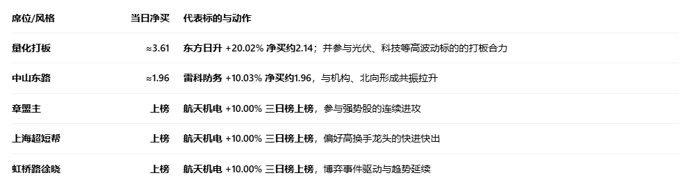 航天机电(600151.SH):连续两日涨停,收于16.94元(+10.00%),三日涨幅偏离累计达20%登上龙虎榜;知名游资章盟主、上海超短帮、虹桥路徐晓上榜,博弈“央企+商业航天”主线的延续性。