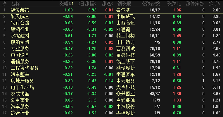 今日板块跌幅靠前的是装修装饰、航天航空、铁路公路、酿酒行业、水泥建材、船舶制造、专业服务、电网设备、通信服务和工程咨询服务等,资金修复盘口还是有一定效果,板块跌幅明显收窄,只有装修装饰板块跌幅超过1%,但是个股风险仍在进一步释放,资金主动修复盘口的情况下还有25家跌停,如果没有资金修盘口、跌停家数短期可能还会进一步增加,所以为什么这里要护盘、就是给板块和个股一个喘息的机会,短期个股风险需要进一步释放。