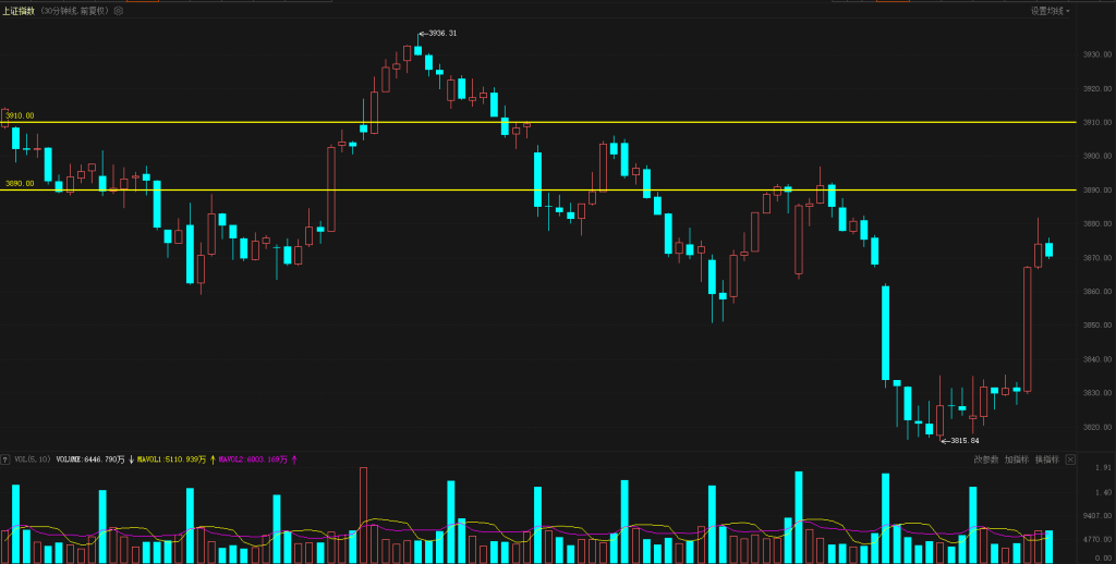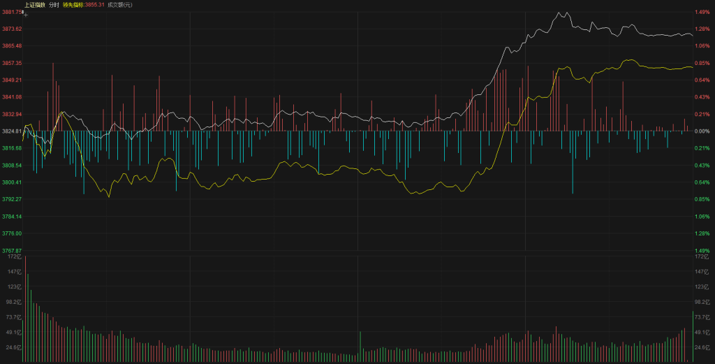 【市场观察】上证指数低开3822点,低开之后一波快速调整、最低下探到了3818点,这是今天最关键的位置,一波下探没有创出新低、这是空方力量出现衰竭的信号,9:30-13:30大盘一直处于横盘震荡的走势,13:30之后指数突然出现快速拉升,各大指数同时上涨、A50也是向上脉冲,黄白线同时上涨、这一波主要是白线领涨,最终上证指数报收3870点,上涨1.19%,创业板指数走势更强,报收3175点、涨幅达到3.39%。