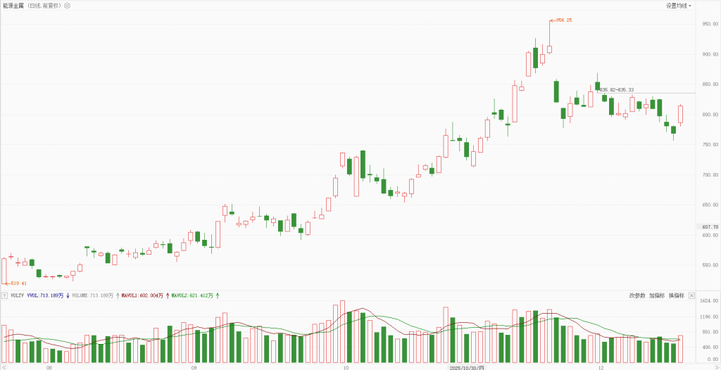 整体保持上升趋势,短期回撤之后有酝酿止跌的迹象,因此目前来看短期是有向好的预期,而随着碳酸锂价格的上涨,有望推动相关企业业绩的增长,所以中期也有向好的预期;但是操作上不能盲目,第一:短期没有确认止跌,现在只是酝酿止跌阶段还需要确认,第二:个股已经经过一轮炒作,资金出现了获利,所以回撤需要等动能释放完毕吗,所以现在的操作要注意分情况,保持上升的可以继续顺趋势,而开新仓,短线等确认止跌,出现确定信号再考虑进场,中期可以关注低位标的,对于低位尚未出现明显获利的补涨品种可以先加自选,等待信号再说。