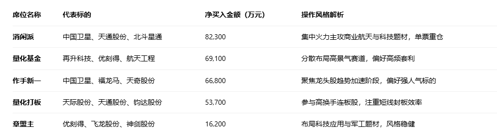 机构净买入航天发展(7.94亿元)、德明利(2.05亿元)等科技龙头,而游资在中国卫星、天际股份等标的上呈现“既有大幅买入也有获利了结”的分化操作。