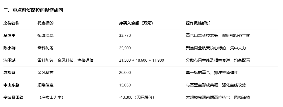 商业航天与军工电子:以雷科防务、航天发展、中国卫星为核心,受商业航天IPO标准落地等政策催化,成为当日最强吸金主线。板块内多股涨停,游资与机构资金深度参与,但内部分歧亦开始显现。
