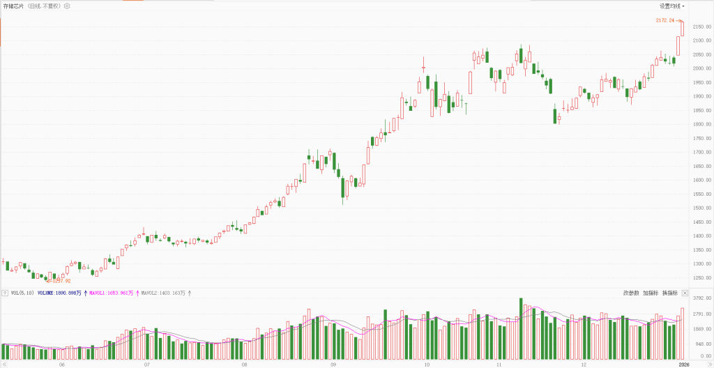 消息面上,据财联社援引报道,三星与海力士已向服务器、PC及智能手机用DRAM客户提出涨价,2026年一季度报价将较2025年第四季度上涨60%-70%。一位半导体行业人士向财联社表示:“客户也清楚,三星和SK在短期内很难迅速提升产能。” 因此业内预计,即便是这么大的涨幅,客户也会接受。市场研究公司DRAMeXchange也分析表示:“大型客户认为他们完全可以承受AI基础设施所需的支出。他们不太可能强烈反对DRAM价格上涨,因为在这些公司看来,实现基于推理的AI盈利更为重要。”在这种情况下,机构对龙头2026年的业绩预期明显乐观。花旗预计,三星电子2026年营业利润将达155万亿韩元,较2025年增长253%;摩根士丹利则预计,SK海力士2026年营业利润为148万亿韩元,较2025年增长224%。