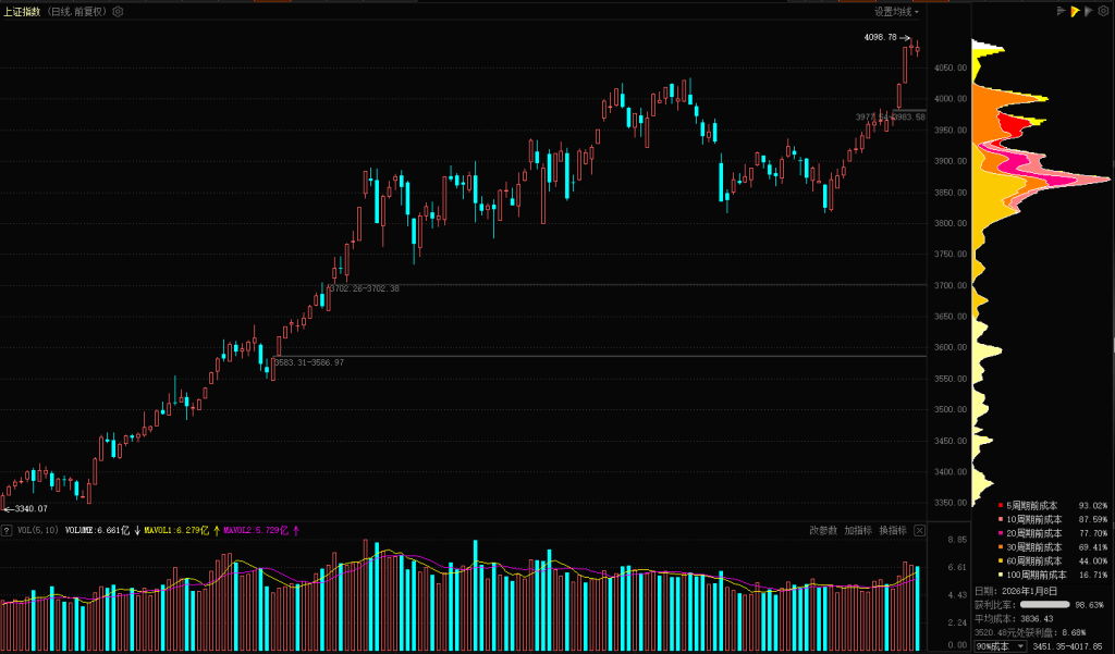 【技术分析】上证指数各周期走势还是十分清晰的,以30分钟为例,本轮反弹从2025年12月16日3815点,第一波反弹3815-3980,然后在3950-3980形成区间震荡,第二波反弹26年第一个交易日跳空高开,突破前期高点4034点、最高上冲到了4098点,再次形成区间震荡的走势,反弹节奏是一波反弹上一个台阶、开始做修整,寻找机会再一波反弹、继续修整,这种缓慢震荡上行正是多方想要的结果,再次验证了目前多方还是处于高水平控盘的状态,当遭遇卖盘压力的时候就选择横盘震荡来消化,特别是25年12月期指空方做了很多准备、想要有所作为的,多方在弹药不足的情况下巧妙的化解了危机,这一轮操盘的水平确实很高。日线筹码来看,上方几乎是没有什么明显压力区间,大部分筹码集中在3850-3900点区域,下一个重点筹码峰的变化,当下方筹码峰开始逐步减少、高位形成新的筹码峰就是一个警示信号,目前来看多方还是能够掌控局面。