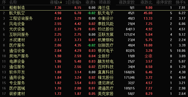 【热点板块】今日板块涨幅靠前的是船舶制造、航天航空、工程咨询服务、风电设备、光伏设备、互联网服务、水泥建材、医疗服务、通信设备和房地产服务等。四维分析来看,行业板块有70个上涨,其中有9个板块涨幅超过2%,下跌板块有16个,个股方面,两市上涨家数是3731家,涨停111家,下跌家数是1595家,跌停6家。盘面整体来看,虽然指数横盘震荡、但是盘口依然是强势特征、板块和个股表现还是十分活跃,涨停家数超过110家。板块来看,军工板块再次领涨,船舶制造、航天航空等都是涨幅靠前,为什么军工板块能够持续走强?第一:消息面刺激,近期外围局势十分复杂,各种突发事件对于军工板块形成刺激,未来可能还有一些不确定因素,所以军工还有很多可以炒作的机会,第二:军工也是未来炒作的主线,几条主线已经讲过很多次了,并且军工板块内部形成了轮动,比如商业航天、船舶和大飞机等也是有轮动的,航天系、航发系等几个也是轮动,下一个阶段还有炒作空间。