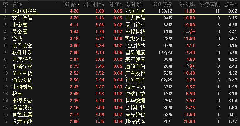 【热点板块】今日行业涨幅靠前的是互联网服务、文化传媒、小金属、贵金属、游戏、航天航空、软件开发、医疗服务、采掘行业和商业百货等。四维分析来看,行业板块有78个上涨,其中有17个板块涨幅超过2%,下跌板块有8个,个股方面,两市上涨家数是3920家,涨停109家,下跌家数是1349家,跌停只有1家。盘面整体来看,上涨家数超过3900家、涨停家数也是接近110家,盘口还是处于强势特征,中长期主线持续发力、点燃了市场做多热情。板块来看,科技板块终于开始发力、特别是传统TMT板块表现较强,包括互联网服务、文化传媒、游戏和软件开发等都是涨幅靠前,科技方向出现了几个轮次的炒作、但是传统TMT概念当中还有一批是处于低位的,昨天年终策略会也重点提到了传媒游戏这个方向,属于潜龙九子、有补涨机会,当最强势的几个板块开始降温、这些补涨板块和个股就会出现机会。