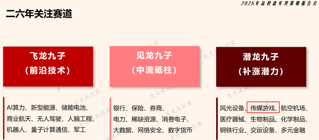 操作策略,重点讲一下板块配置的思路,2026年重点关注的赛道、在年终策略会已经讲的很清楚了,包括飞龙九子、见龙九子和潜龙九子,首先你要选择适合自己的方式,如果强势板块和个股、你驾驭不了,那你就可以从潜龙九子里寻找反复打底的补涨潜力股,同时要注意板块配置,所以配置就是你不能全仓压在某一个板块或者个股,未来行情会是几条主线轮动行情,更适合分仓进行布局。