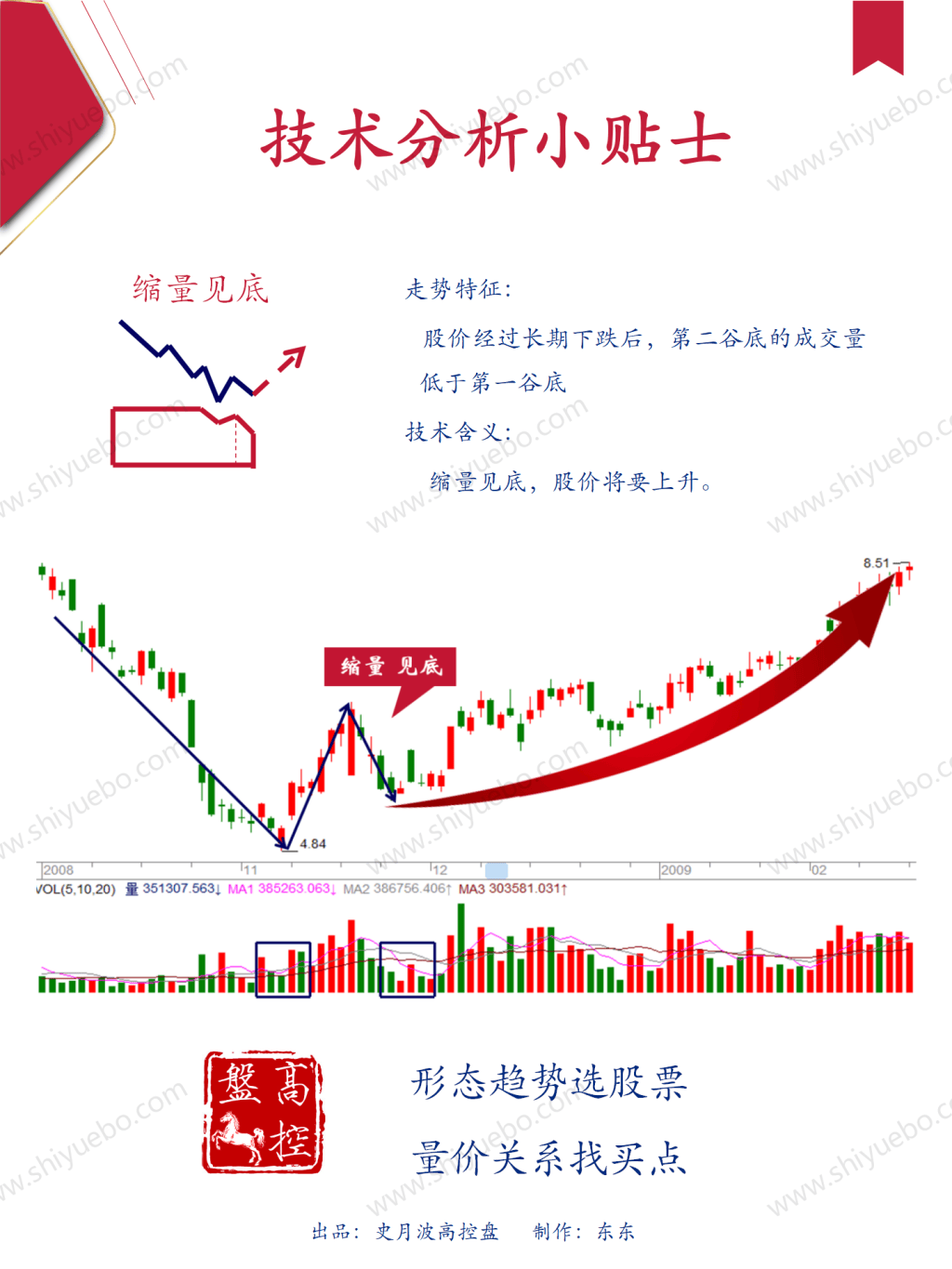 今天的技术分析小贴士,高控盘量价——缩量见底,走势特征:股价经过长期下跌后,第二谷底的成交量低于第一谷底技术含义:缩量见底,股价将要上升。