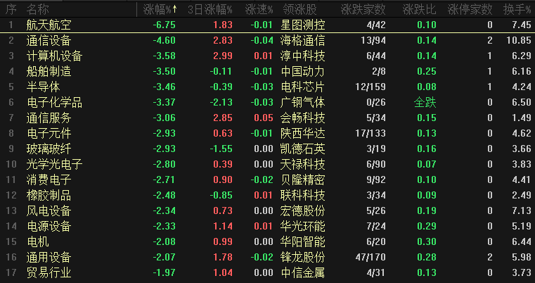 今日板块跌幅靠前的是航天航空、通信设备、计算机设备、船舶制造、半导体、电子化学品、通信服务、电子元件和玻璃纤维等,商业航天板块出现大幅调整,连续诱多之后、短线资金开始高位兑现利润,近期诱多信号已经十分明显了,以龙头卫通为例,前面两个交易日都是涨停,看上去很强、但是分时图来看都是尾盘封板,结合日线来看近期都是巨量,所以商业航天等板块的调整是可以进行规避的,但是对于新股民来讲就容易吃亏,高位套牢的等于是给市场交学费了,下一个阶段这一批个股可能还有反复、也还有拉升的机会,但是已经不适合再去新开仓。
