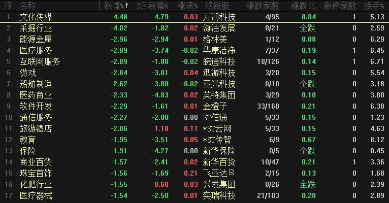 今日板块跌幅靠前的是文化传媒、采掘行业、能源金属、医疗服务、互联网服务、游戏、船舶制造、医药商业、软件开发和通讯服务等,商业航天开始调整之后、短期热点板块文化传媒和游戏等都开始出现调整,近期连板的个股数量越来越少,主要针对的就是短线游资疯狂炒作的品种,这一批个股依然要回避,前一段时间喜欢追高不少投资者都能吃一口肉、抓个涨停板,但是近期要转变思路了、调整自己的操作策略。