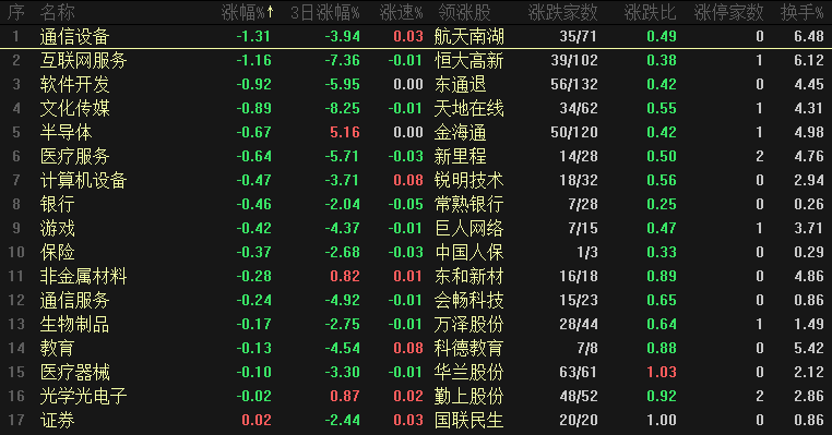 今日板块跌幅靠前的是通信设备、互联网服务、软件开发、文化传媒、半导体、医疗服务、计算机设备、银行、游戏和保险等,只有两个板块跌幅超过1%、但是跌停家数达到了30家,而金融和科技两大龙头板块继续维持调整状态,也说明当前盘面并不是强势特征,本轮个股风险尚未完全释放完毕,即使短期指数能够稳住、也要当心个股风险,包括近期个股释放利空消息也开始增多,这类品种需要注意。