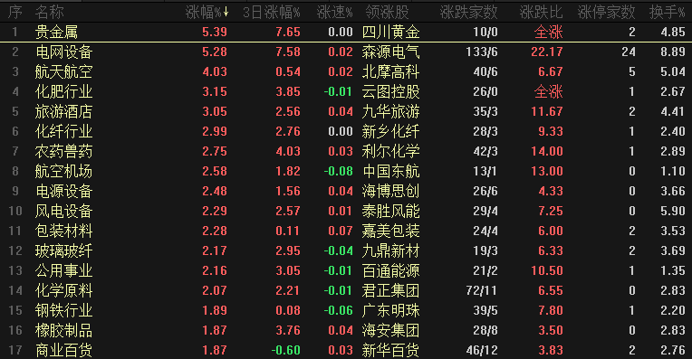 【热点板块】今日行业涨幅靠前的是贵金属、电网设备、航天航空、化肥行业、旅游酒店、化纤行业、农药兽药、航空机场、电源设备和风电设备等。四维分析来看,行业板块有70个上涨,其中有14个板块涨幅超过2%,下跌板块有16个,个股方面,两市上涨家数是3527家,涨停103家,下跌家数是1828家,跌停30家。盘面整体来看,市场连续几个交易日降温之后、有资金开始修盘口,为什么一定要修盘口?这一轮调整是为了降温、准确来讲是控温,市场稳定控制在合适的温度,跌停家数连续增多、温度过低,如果继续扩散跌停家数可能会接近100家,所以必须要出手了。板块来看,电网设备继续领涨,这是目前热度最高的板块,现在连板10只股票当中有7只都是电网设备,这个方向还会有热度,消费板块也是继续保持轮动状态,旅游酒店和航空机场等涨幅靠前,这是确定性方向、也是十五五的主线之一。资金主动选择拉升航天航空,本轮快速降温导火索就是商业航天、航天航空集体大幅下跌,想要修盘口、恢复人气还是要先拉航天航空,同时有一部分是属于资金自救的动作,所以高位个股还是要小心。