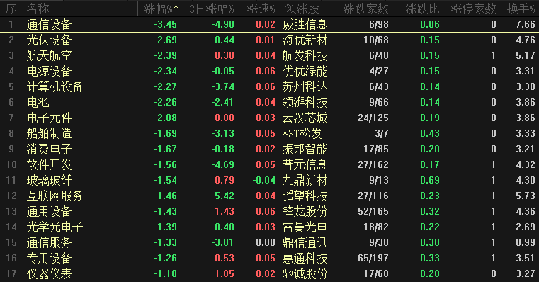 今日板块跌幅靠前的是通信设备、光伏设备、航天航空、电源设备、计算机设备、电池、电子元件、船舶制造、消费电子和软件开发等。科技和军工两大板块都是跌幅靠前,也可以看出近期市场人气并不高、做多情绪出现降温,出现一个有意思的现象,碳酸锂期货今天尾盘再次涨停,但是股票市场相关个股依然是下跌状态,股票和期货并没有形成联动,大宗商品产业资本对于市场是非常敏感的,A股近期一系列政策出来这些资本就懂了,没有选择继续在股票市场进行炒作,所以大宗商品相关股票和期货、现货走势并不是完全一致的,也反应出各路资金对于短线炒作是比较谨慎的。