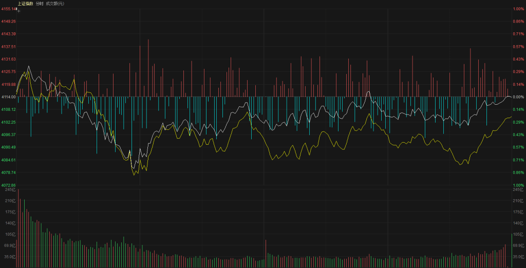 市场观察】上证指数小幅高开4116点,开盘之后小幅上冲、反弹仅持续5分钟左右开始震荡回落,而这一波调整持续时间达到了1个小时、最低点下探到了4080点,盘中银行等权重板块开始发力进行护盘,指数企稳回升、开始转为横盘震荡结构,白线表现相对坚挺、黄线还是持续调整状态,下午两次尝试收红、但是都没有稳住,最终上证指数报收4113点,下跌0.01%,创业板指数报收3277点,下跌1.79%。