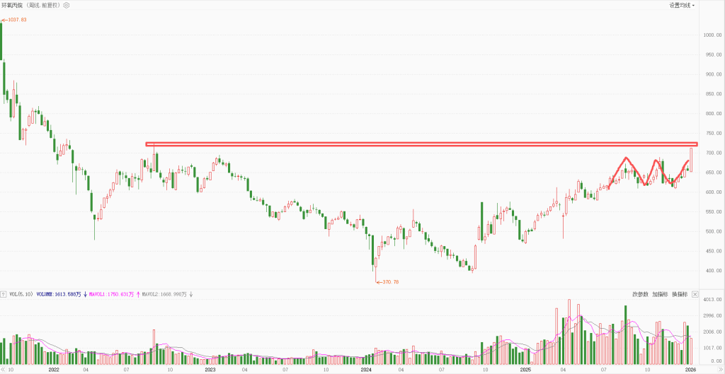 据生意社数据,1月20日,环氧丙烷基准价为8500.00元/吨,与本月初(7733.33元/吨)相比,上涨了9.91%。中银证券表示,一方面,财政部宣布自2026年4月1日起取消初级形状聚醚的出口退税政策,引发企业出口订单前置,另一方面,东方盛虹、联泓格润等企业聚醚产量增长,增加了对环氧丙烷的消耗。