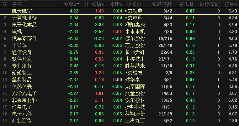 今日板块跌幅靠前的是航天航空、计算机设备、电子化学品、电机、汽车零部件、半导体、通信设备、软件开发、专业服务和船舶制造扥,军工和科技两大龙头板块都是跌幅靠前,这两大龙头下跌也体现出市场人气出现降温,商业航天等相关板块跌幅都超过4%,上周也讲到了连续下跌之后出现反弹,但有一批个股都是下跌趋势内的反弹,短期看这部分品种还有调整的空间,科技这几个板块调整压力也比较大。