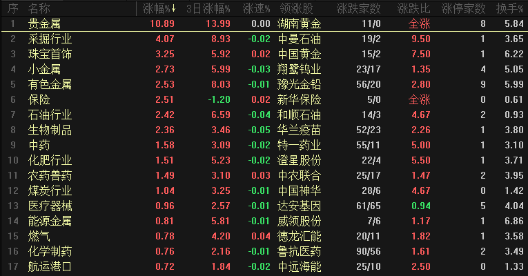 【热点板块】今日行业涨幅靠前的是贵金属、采掘行业、珠宝首饰、小金属、有色金属、保险、石油行业、生物制品、中药和化肥行业。四维分析来看,行业板块有22个上涨,其中有8个板块涨幅超过2%,下跌板块有64个,个股方面,两市上涨家数是1604家,涨停77家,下跌家数是3771家,跌停40家。盘面整体来看,市场还有一部分板块和个股保持活跃状态,涨停家数还有77家,但是下跌家数开始增加、跌停家数又到了40家,个股风险再次开始释放。板块来看,涨幅靠前的板块分为三个部分,第一:贵金属、珠宝首饰、小金属、有色金属等,黄金现货和期货的持续大涨、带动黄金等相关板块集体上涨,贵金属板块涨幅超过10%,全面涨停,黄金个股当中有几只都是多次打开涨停、并且是尾盘封板,部分品种出现诱多的迹象。第二:保险、石油等权重板块,这些板块主要任务是稳指数,今天如果不是权重护盘、整个盘面走势会比较惨烈。第三:生物制品和中药等医药方向,医药方向异动主要是消息刺激引发,反弹持续性还需要观察,从这三个热点方向来看都没有出现很好的短线上手点。