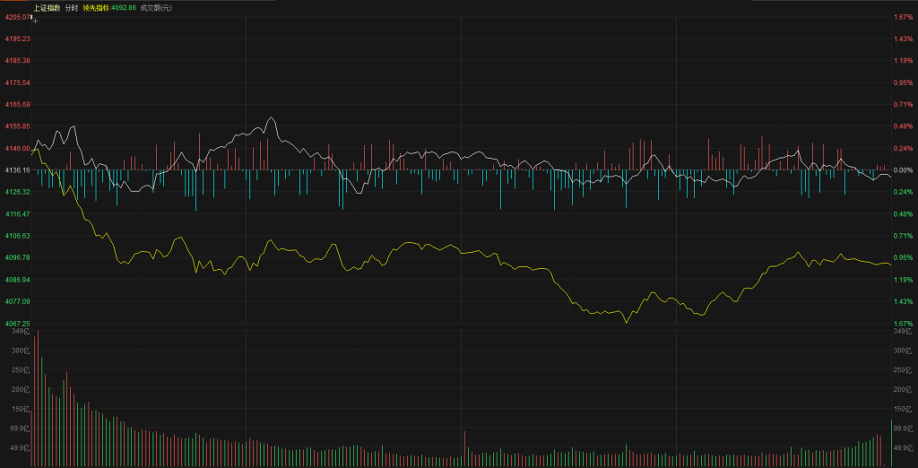 【市场观察】上证指数小幅高开4144点,早盘第一个小时分时尝试了两波反弹、两波反弹都是反弹到4160点附近开始震荡回落,黄白线全天呈现分化状态,白线表现相对坚挺、全天维持窄幅震荡的走势,权重板块上涨暂时稳住了指数,而中小市值个股持续震荡下行的走势,14点之后开始尝试震荡企稳,最终上证指数报收4132点,下跌0.09%,创业板指数报收3319点,下跌0.91%。