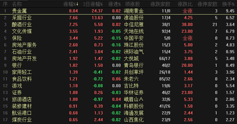 【热点板块】今日行业涨幅靠前的是贵金属、采掘行业、酿酒行业、文化传媒、保险、房地产服务、石油、房地产开发、银行和家用轻工等。四维分析来看,行业板块有31个上涨,其中有7个板块涨幅超过2%,下跌板块有54个,个股方面,两市上涨家数是1803家,涨停86家,下跌家数3566家,跌停35家。盘面整体来看,当前处于板块切换阶段、会造成盘面出现波动,下跌和跌停数量还是不少,部分板块和个股还会延续这种波动状态。板块来看,贵金属依然保持强势,黄金期货和现货价格势不可挡、持续刷新历史新高,贵金属板块一部分个股已经有资金开始悄悄降成本了,酿酒、保险、地产和石油等权重板块是护盘主力军,权重板块迎来普涨、但是上涨逻辑并不相同,保险板块等这一批是中长期处于反弹趋势的,是有创新高的能力的,而白酒、中药和地产等是下跌趋势中出现的反弹,以酿酒板块为例,下午开始分时呈现资金持续流入状态、日线也是拉出一颗长阳线,资金确实有流入的动作、但是并没有改变中长期的趋势,包括中药和地产龙头品种也是一样。