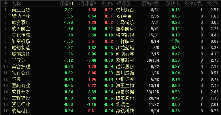 今日板块跌幅靠前的是商业百货、酿酒行业、旅游酒店、航天航空、文化传媒、航空机场、船舶制造、玻璃纤维、半导体和美容护理等,近期板块上涨都是呈现“一日游”的行情,包括军工、科技、煤炭和消费板块反弹都是反弹一个交易日就开始出现调整,所以这种环境下最忌讳的追涨杀跌、频繁换股操作,你看技术走势上形成突破、均线金叉等出现短期多头信号,追进去可能就会调整,现在做短线机会并不多、而且很容易搞你的心态,这个阶段就先养股票、不用着急上手。