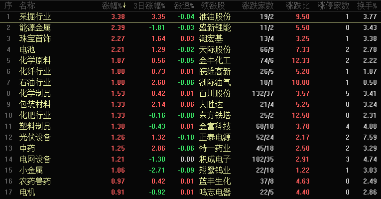 【热点板块】今日行业板块涨幅靠前的是采掘行业、能源金属、珠宝首饰、电池、化学原料、化纤行业、石油行业、化学制品、包装材料和化肥行业等。四维分析来看,行业板块有45个上涨,其中有4个板块涨幅超过2%,下跌板块有38个,个股方面,两市上涨家数是2749家,涨停61家,下跌家数是2550家,跌停10家。盘面整体来看,个股涨跌比基本持平,市场整体表现较为平淡。板块来看,采掘行业、能源金属和化学、化工等涨幅靠前,黄金、白银进入大幅波动阶段,但其他资源板块仍存机会,正如此前所述,大宗商品中长期行情尚未结束,特别是一些低位的板块还是有机会的,化工、化学这个方向这是多次讲到的,包括石油相关板块也是出现异动,大宗商品本轮炒作是金属类出现大幅上涨,黄金、白银和有色金属等涨幅都很大、而石油一直没有出现大幅上涨的动作,原油在关键位持续震荡、随时可能会出现变盘,这个方向可以关注。