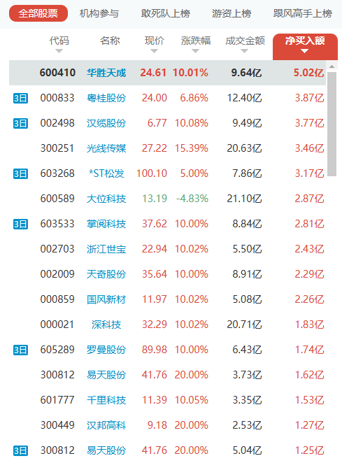 从净买入额来看,资金呈现出极强的 “抱团” 特征。华胜天成(600410) 以 5.02 亿元的净买入额一骑绝尘,成为当日绝对的资金核心。该股在算力与数字经济赛道的强势表现下,全天成交 9.64 亿元,涨幅达 10.01%,展现出极高的市场辨识度与资金共识。