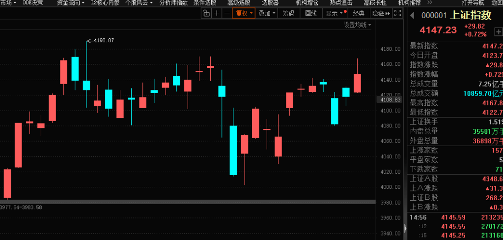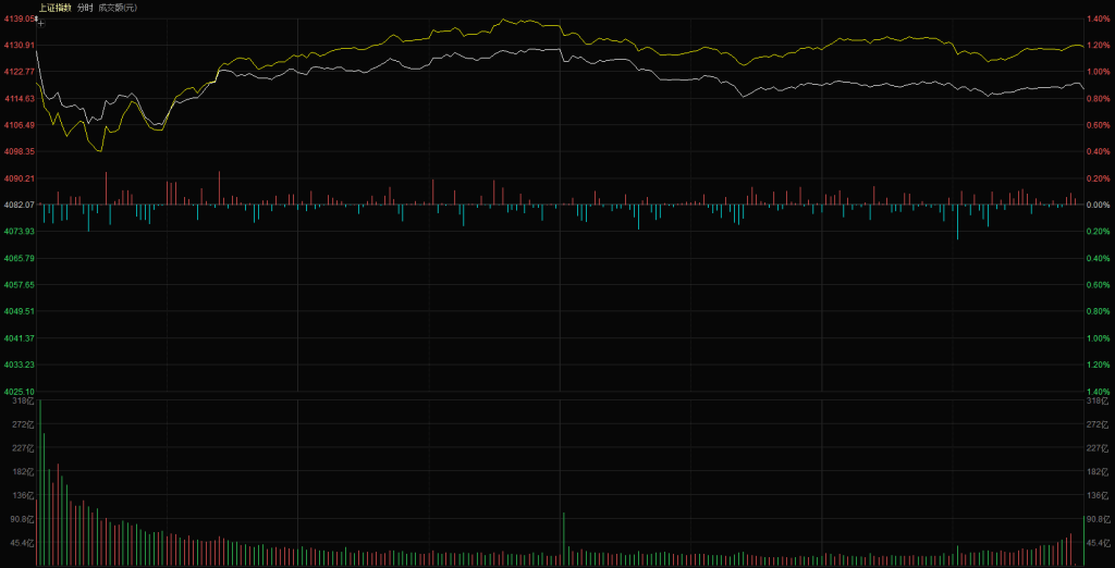 【市场观察】上证指数高开4129点,高开后出现一波回落,节前博弈高开的资金开始兑现离场,随后指数再度震荡上行,临近午盘创出日内高点 4131 点,午后开盘之后小幅震荡回落,整体来看,早盘高开之后基本维持横盘震荡的走势,分时走势未出现明确的反弹结构,也无资金持续流入,整体维持相对稳定,最终上证指数报收4117点,上涨0.87%,创业板指数报收3308点,上涨0.99%。