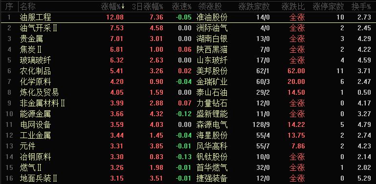 【热点板块】今日行业板块涨幅靠前的是油服工程、油气开采、贵金属、玻璃纤维、农化制品、化学原料、炼化及贸易、非金属材料和能源金属等。四维分析来看,行业板块有108个上涨,其中有38个板块涨幅超过2%,下跌板块有20个,个股方面,两市上涨家数是4006家,涨停109家,下跌家数是1392家,跌停21家。盘面整体来看,节后第一个交易日市场活跃度有所提升,涨停家数达到了109家,大盘也是红盘报收,核心原因是大宗商品价格再度走高,期货市场上,沪银涨幅近 13%、碳酸锂涨幅超 10%、原油涨幅也达 6%,石油、金属、化工和农产品等大宗商品相关板块集体上涨,今天资金的方向也是集中在了这些板块,外围市场消息变化来看、刺激力度最大的就是石油和贵金属,特别是石油相关板块是表现最强的,油服工程、油气开采等都是领涨,石油板块除游资、产业资本参与外,也有机构资金布局,三桶油也有拉动指数的任务,中海油和中石油都创出了新高,下一个阶段大宗商品相关板块还会保持轮动状态,可以等待低吸或者补涨的机会。