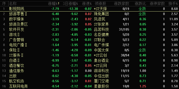 今日板块跌幅靠前的是影视院线、旅游零售、数字媒体、旅游及景区、软件开发、游戏、广告营销、电视广播、保险和IT服务等,“吃喝玩乐”等消费板块跌幅靠前,影视和旅游板块跌幅都超过6%,这两个板块为何下跌?核心原因是节后消费板块缺乏可炒作的新预期,春节作为消费旺季落幕,行业即将进入需求空白期,这一波反弹之后资金选择了高位兑现利润,电影和旅游出现过很多次春节、五一和十一等假期之后就会大幅调整,只有少部分个股会有一些表现,资金逐步转向确定性机会。