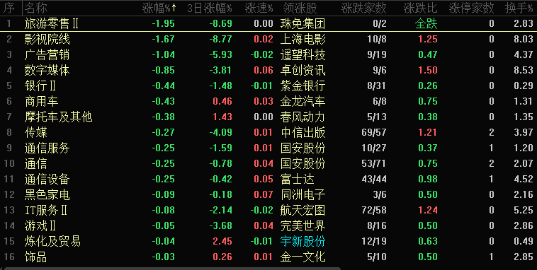 今日板块跌幅靠前的是旅游零售、影视院线、广告营销、数字媒体、银行、商用车、摩托车、传媒、通信服务和通信等,下跌板块集中在消费、科技和金融板块,消费、科技板块延续短期调整态势,昨天也讲到了中长期这两个板块还有机会,但是短期需要回避,而金融板块午后出现主动压盘动作,银行、保险及部分中字头个股顺势下探,市场依旧处于控温节奏中。
