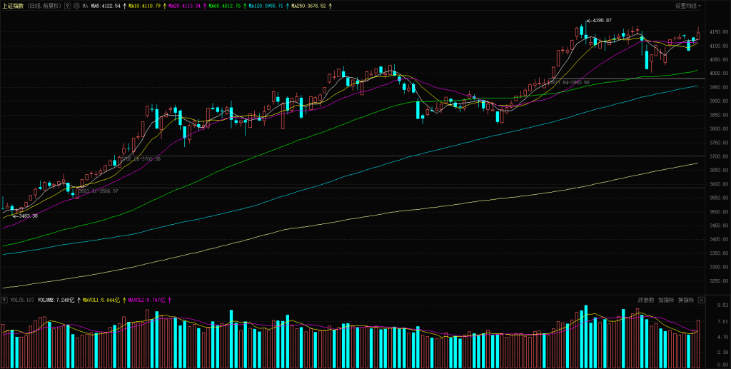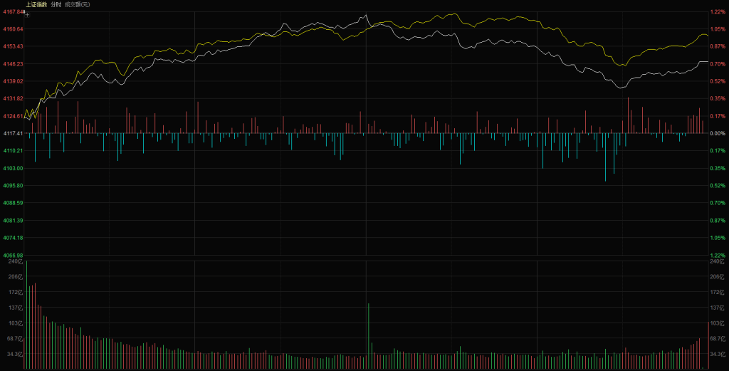 【市场观察】上证指数高开4123点,节后两个交易日均跳空高开,今日高开后便走出震荡上行走势,9:30-11:30上午两个小时走出了标准的分时反弹结构,以 45 度角持续上推,黄白线同步上扬,这个分时结构比昨天走势更好,创出日内高点 4167 点,逼近前期高点 4170 点后开始震荡回落,尾盘还有一个向上冲的动作,整体来看走势还是比较强的,最终上证指数报收4147点,上涨0.72%,创业板指数报收3354点,上涨1.41%。