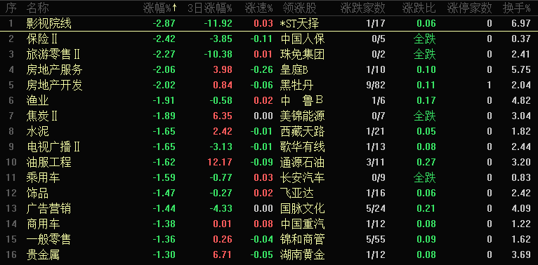 板块跌幅靠前的是影视院线、保险、旅游零售、房地产服务、房地产开发、渔业、焦炭、水泥、电视广播等,影视院线板块继续领跌,板块三日跌幅超过11%,个股经历了大幅调整,近期轮动速度比较快、游资主导的品种快速上涨之后都会有快速下跌,切记不要追高,而房地产及相关板块同样出现调整,昨日也提到,地产板块的反弹由各类消息面刺激引发,板块存在较多不确定因素,仍需进一步观察。