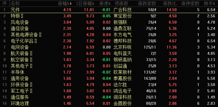 【热点板块】今日板块涨幅靠前的是元件、特钢、风电设备、通信设备、其他电源设备、电子化学品、电网设备、航天装备、航空装备和其他电子等。四维分析来看,行业板块有53个上涨,其中有7个板块涨幅超过2%,下跌板块达到75个,个股方面,两市上涨家数是2485家,涨停78家,下跌家数是2870家,跌停5家。从整体盘面来看,板块与个股的活跃度有所降温,近期的市场控温策略开始显现效果,市场人气同步回落。板块来看,高端装备相关板块涨幅居前,风电设备、通信设备、其他电源设备、电网设备等装备类板块集体领涨,当前市场仍处于板块轮动节奏中,第一条主线为大宗商品类,今日资源板块虽出现分化,但从中长期来看仍处于强周期,后续仍存布局机会,另一条就是以电网设备和电源设备等确定性机会,这一条主线也是反复提示,每天领涨板块不断切换、但都是围绕这几条主线展开。