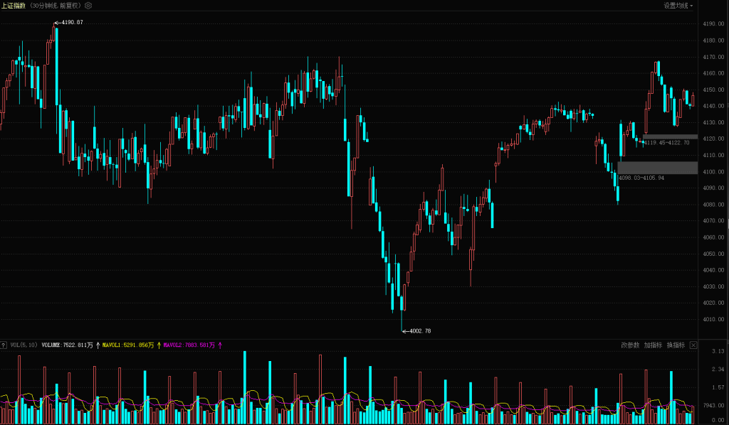 【技术分析】上证指数收出一根带下影线的阴 K 线,上方两个高点4170点和4190点依然没有形成突破,日线级别仍维持震荡结构,指数若想持续反弹、突破这两个前期高点,首要条件是补量,上证指数小幅缩量,成交额 1.07 万亿元,该量能水平不足以支撑直接突破前期高点,而创业板的量价结构同样存在问题,昨日收阳未出现明显放量,成交额 6200 亿元;今日收出一根阴线,成交量反而出现放大,从各大指数的量价结构来看,目前尚未满足向上突破的条件,前期反复讲的那颗关键K线还没有出来。从 30 分钟级别来看,指数从 4002 点反弹后逼近 4170 点压力位,随后开始向下回踩,这一波回调属于正常的技术性调整,且并未形成破位,此前的小级别反弹结构依然成立,短期还有机会尝试上攻、就看多方能否把握这一次机会了。