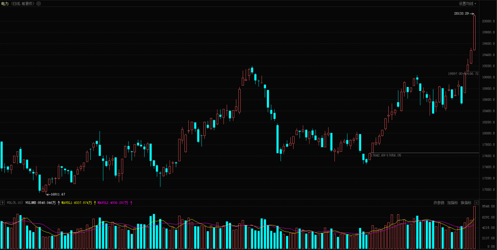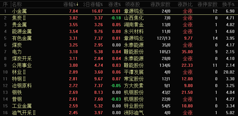 【热点板块】今日行业板块涨幅靠前的是小金属、焦炭、贵金属、能源金属、有色金属、煤炭、电力、煤炭开采、公用事业和林业等。四维分析来看,行业板块有127个上涨,其中有21个板块涨幅超过2%,下跌板块有28个,个股方面,两市上涨家数是3271家,涨停91家,下跌家数是2068家,跌停只有1家。盘面整体来看,金属和煤炭集体上涨带动了市场情绪,大宗商品板块持续火热,资金认可度较高,有效提振了市场活跃度。板块来看,金属类板块延续强势,小金属、贵金属、能源金属、有色金属等均涨幅居前,金属类板块多数标的处于高位震荡走势,该位置虽仍有机会,但难以找到合适的介入点,可关注煤炭、电力、钢铁等低位板块的补涨机会,以煤炭板块为例,其板块指数已创出新高,主要由中煤系等少数标的带动走高,板块内仍有不少煤炭个股处于低位,电力、钢铁等其他资源板块,同样存在较多补涨机会,电力板块今日有 9 只个股涨停,板块领涨龙头已走出 9 连板走势,电力板块此前属于相对冷门板块,但近期资金关注度持续提升,为板块带来了更多想象空间。
