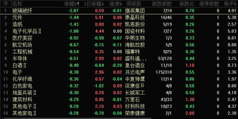 今日板块跌幅靠前的是玻璃纤维、元件、造纸、电子化学品、医疗美容、航空机场、工程机械、半导体、白酒和电子等,28 个板块收跌,其中仅玻璃纤维板块跌幅超 2%,其余板块均为小幅调整,跌停只有1家,这是否意味着个股风险已释放完毕?此前中小市值个股曾集中释放风险,且下跌速度较快,当前当前沪深 300 成分股中,一批高位龙头个股开始释放风险,这类标的资金持续流出,其持续阴跌的走势同样需要警惕。