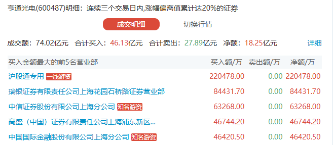 亨通光电(600487) 以 18.25 亿元的净买入额登顶当日龙虎榜,成为全市场资金焦点。买入前五席位中汇聚了多家一线知名游资,且呈现出 “协同加仓、分段拉升” 的特征 —— 早盘分歧阶段低吸布局,午后资金回流时集中扫货,形成了极强的资金合力,直接奠定了光电通信赛道的主线地位。