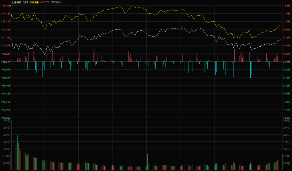 【市场观察】上证指数小幅高开 4109 点,全球股市集体下跌后开启超跌反弹,部分市场同步推出救市政策,A 股受此提振顺势高开。高开后指数小幅回落,核心原因仍是市场信心不足;10:00 起指数进入缓慢震荡上行阶段,资金开始拉升中小市值板块,黄线全天保持领涨态势;13:30 后指数再度震荡回落,最终上证指数报收 4180 点,上涨 0.64%;创业板指报收 3216 点,上涨 1.66%。