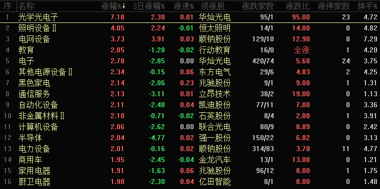 今日行业板块涨幅靠前的是光学光电子、照明设备、电网设备、教育、电子、其他电源设备、黑色家电、通信服务、自动化装备和非金属材料等。四维分析来看,行业板块有126个上涨,其中有13个板块涨幅超过2%,下跌板块有31个,个股方面,两市上涨家数是4079家,涨停79家,下跌家数是1306家,跌停7家。
