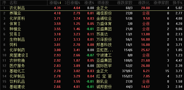 今日行业板块涨幅靠前的是农化制品、养殖业、化学原料、体育、种植业、贸易、生物制品、饲料、化学制药和房屋建设等。四维分析来看,行业板块有139个上涨,其中有45个板块涨幅超过2%,下跌板块有18个,个股方面,两市上涨家数是4260家,涨停88家,下跌家数是1154家,跌停5家。